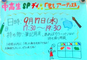 9月の中高生スペシャルデイは・・・「君もアーティスト」です!