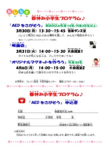 春休み小学生プログラム 2026.03.19 Tweet シェア <春休み小学生プログラムのお知らせ> 春休みもフレミラで楽しく遊んで学ぼう! 「AEDをさがそう」3月30日(月)13:30~15:45 事前申し込み先着10名募集中!(対象を1年生からに変更しました!) 「映画会」3月31日(火)14:00~15:30 タイトルが気になる人は、フレミラできいてね!⭐ヒント:あのビスケットのどうぶつたちの映画だよ!⭐ 「オリジナルマグネットを作ろう」4月6日(月)14:00~15:00 先着30名 Tweet シェア