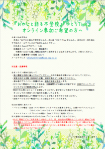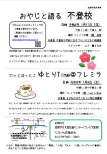 ※昨今の状況を受け、『おやじと語る不登校』及び『ホッとほっとこ ゆとりTime@フレミラ』はオンラインでのご参加も受付ています※