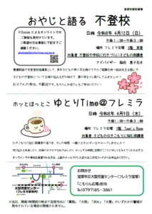 ※昨今の状況を受け、『おやじと語る不登校』及び『ホッとほっとこ ゆとりTime@フレミラ』はオンラインでのご参加も受付ています